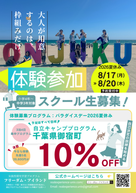 何をしてもいい、何もしないでもいい。責任を果たせる自信があるのなら、“本物の自由” を手にできる。(年3〜4回開催/3〜5日間集中プログラム)【フィールド:千葉県御宿町、新潟県十日町市(積雪期のみ)】