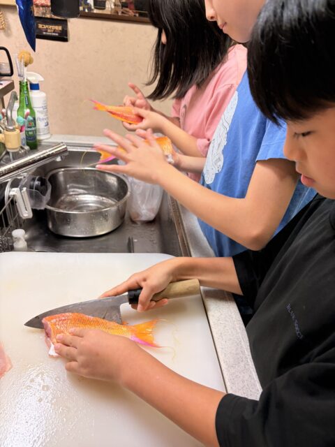 大きな魚が釣れたら、お刺身に自分で調理して食べましょう(大物が釣れなったときは唐揚げにします)。